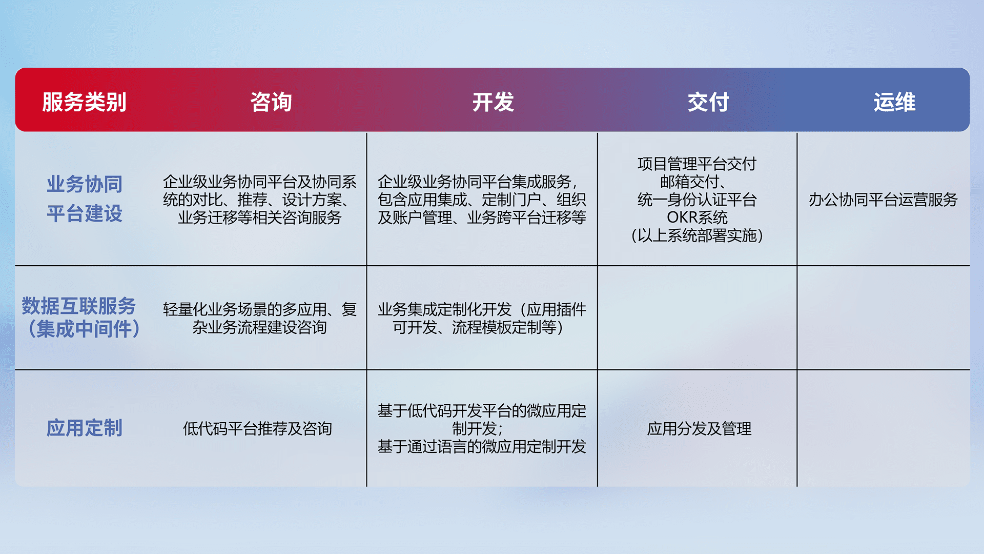 针对钉钉、、、企微、、、IDaas等平台级产品提供产品的规划、、、方案、、、、交付、、、、定制化开发等服务,,实现如统一协同办公、、、智能客户服务、、混合会议管理、、、智能数据查询、、、等业务场景,,,,实现数字化转型。。。。
